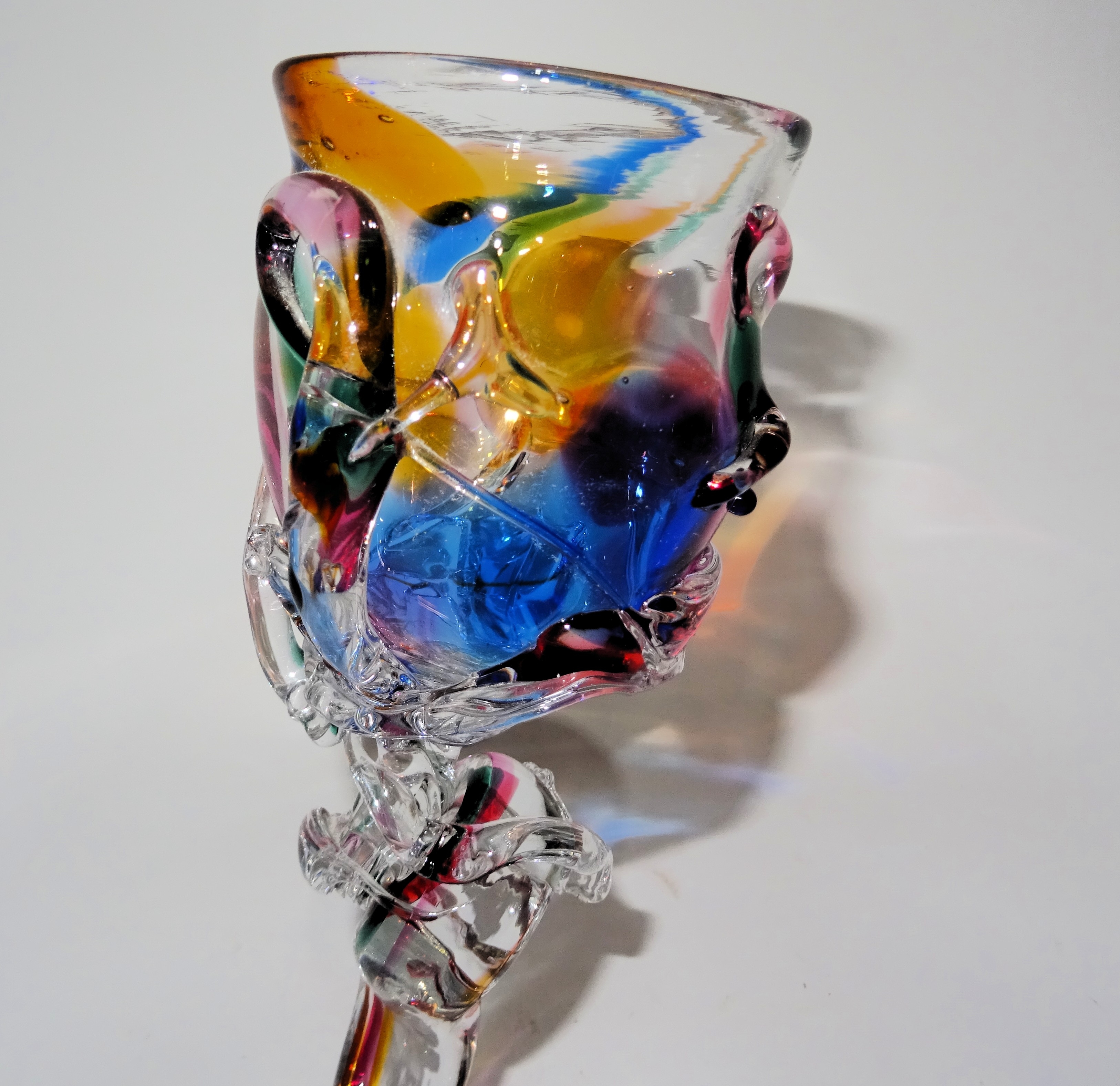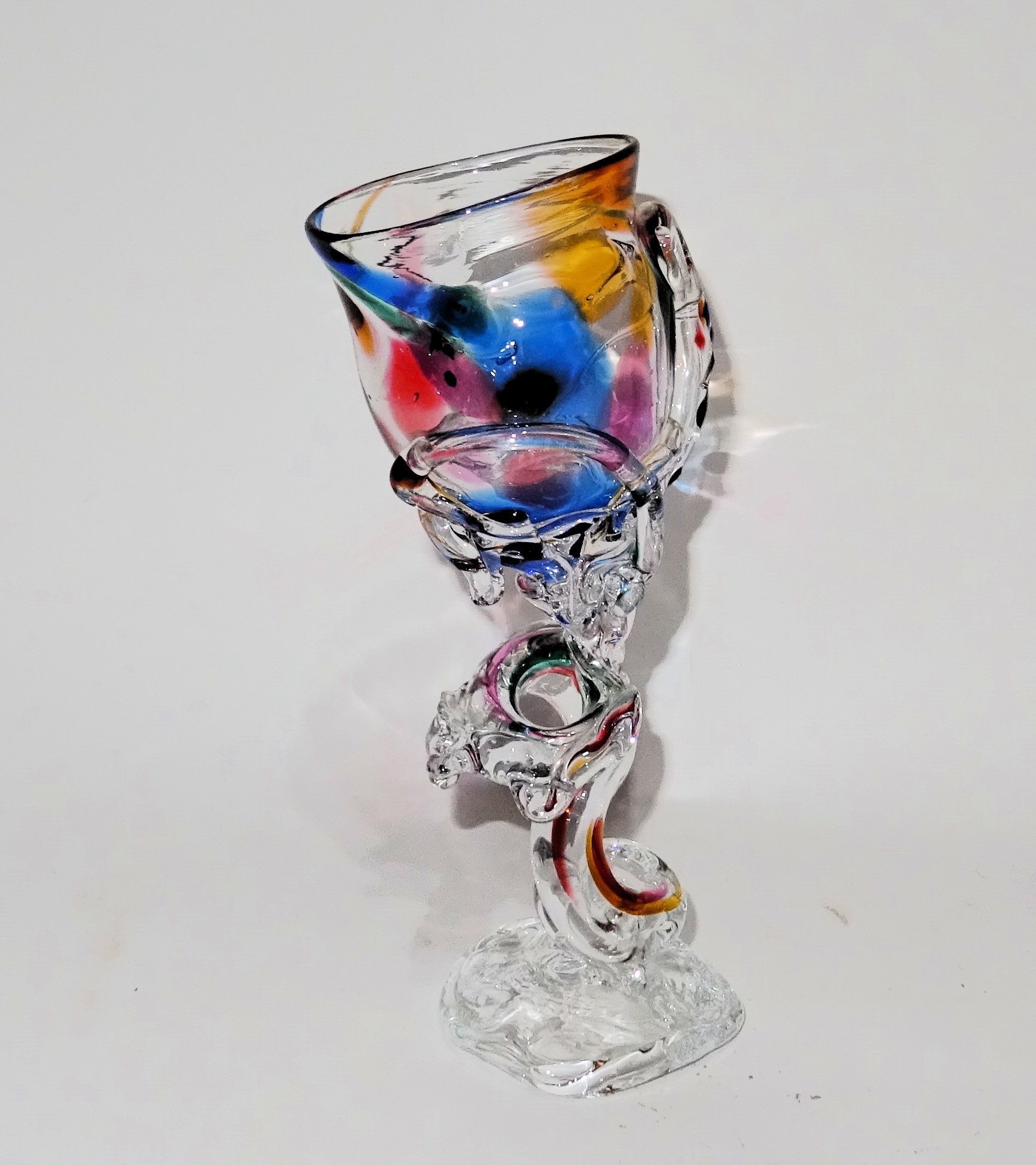 Leuk vormgegeven unica wijnglas met diverse kleuren, ontwerp en uitvoering Yvon Trossél. Hoogte 21 cm, gesigneerd.