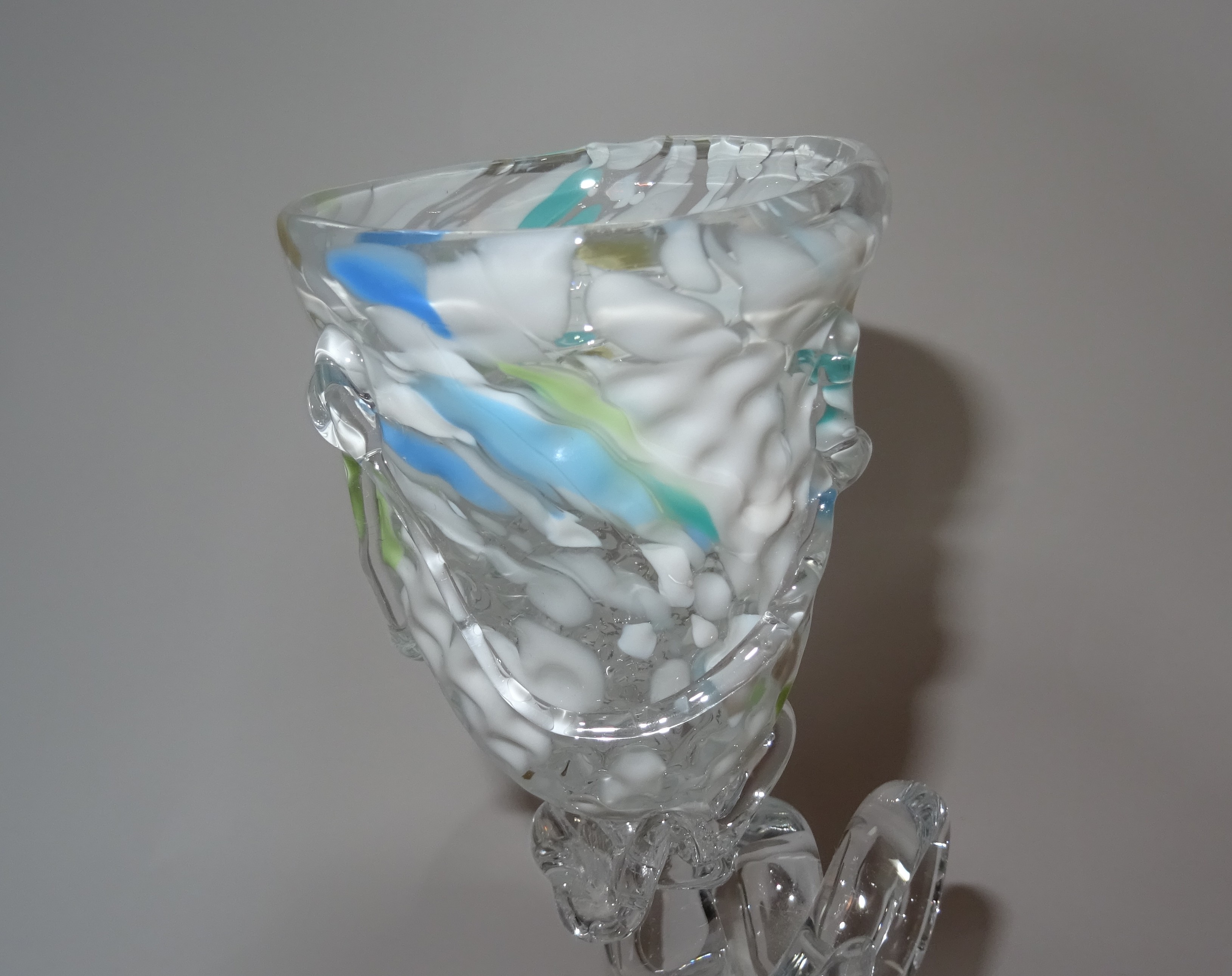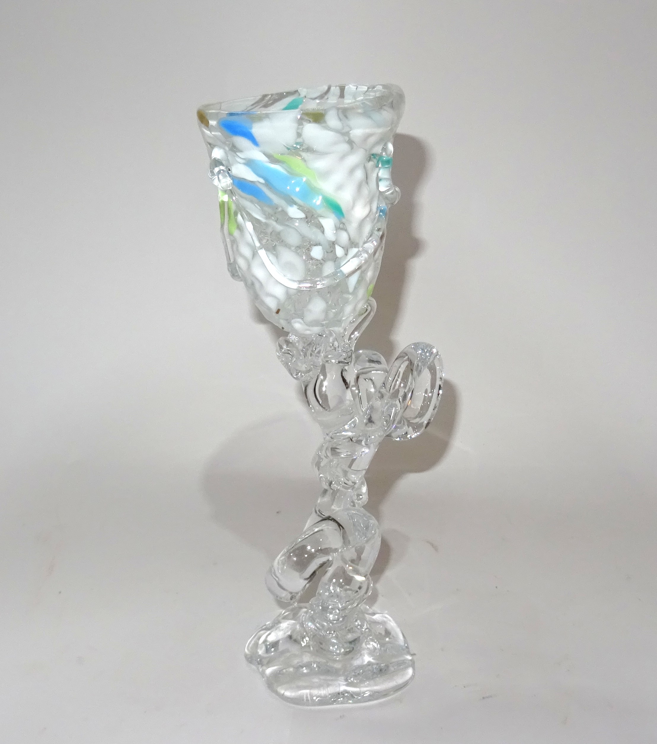 Een unica wijnglas / glasobject in voornamelijk wit blauw. Ontwerp en uitoering Yvon Trossél.