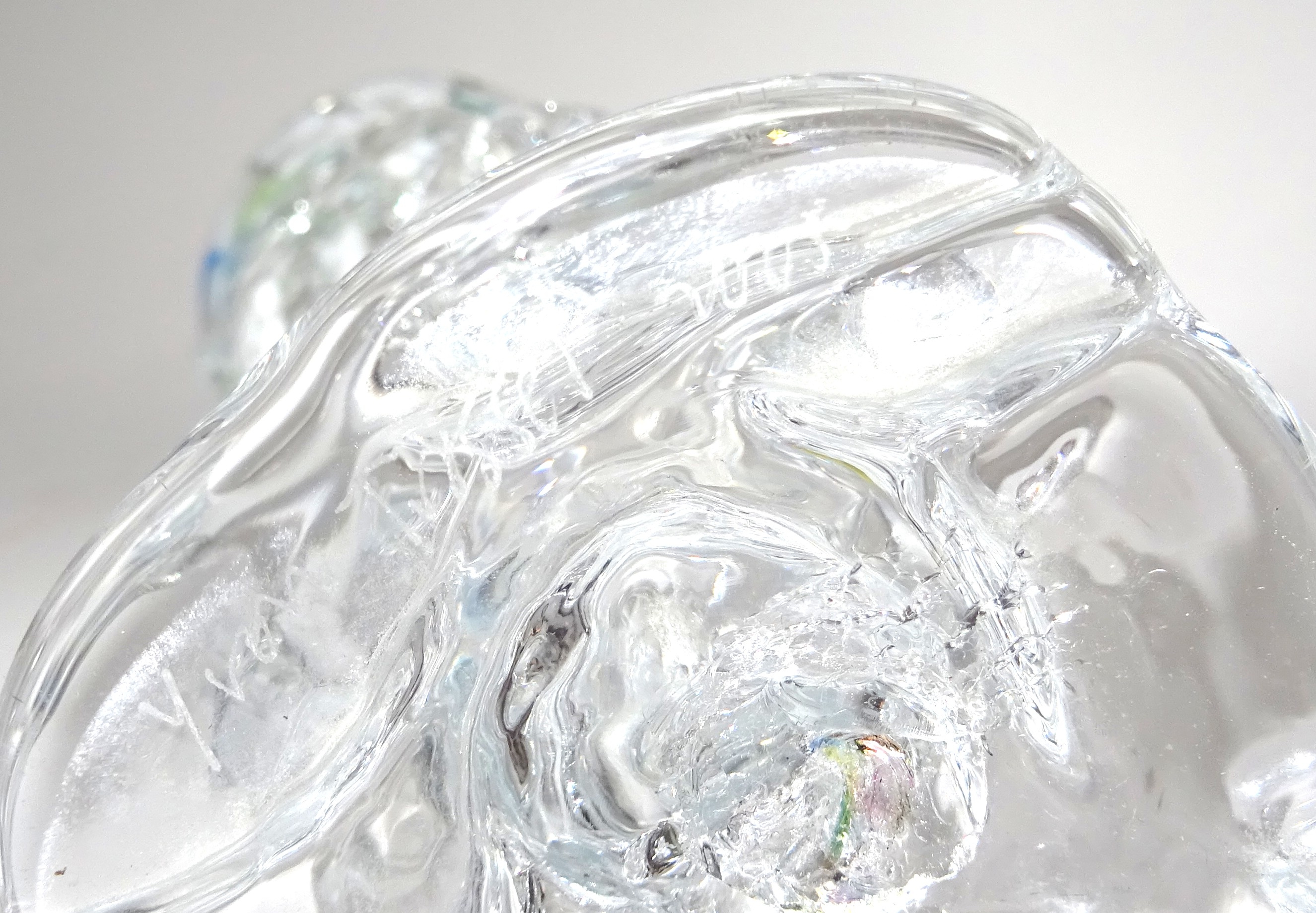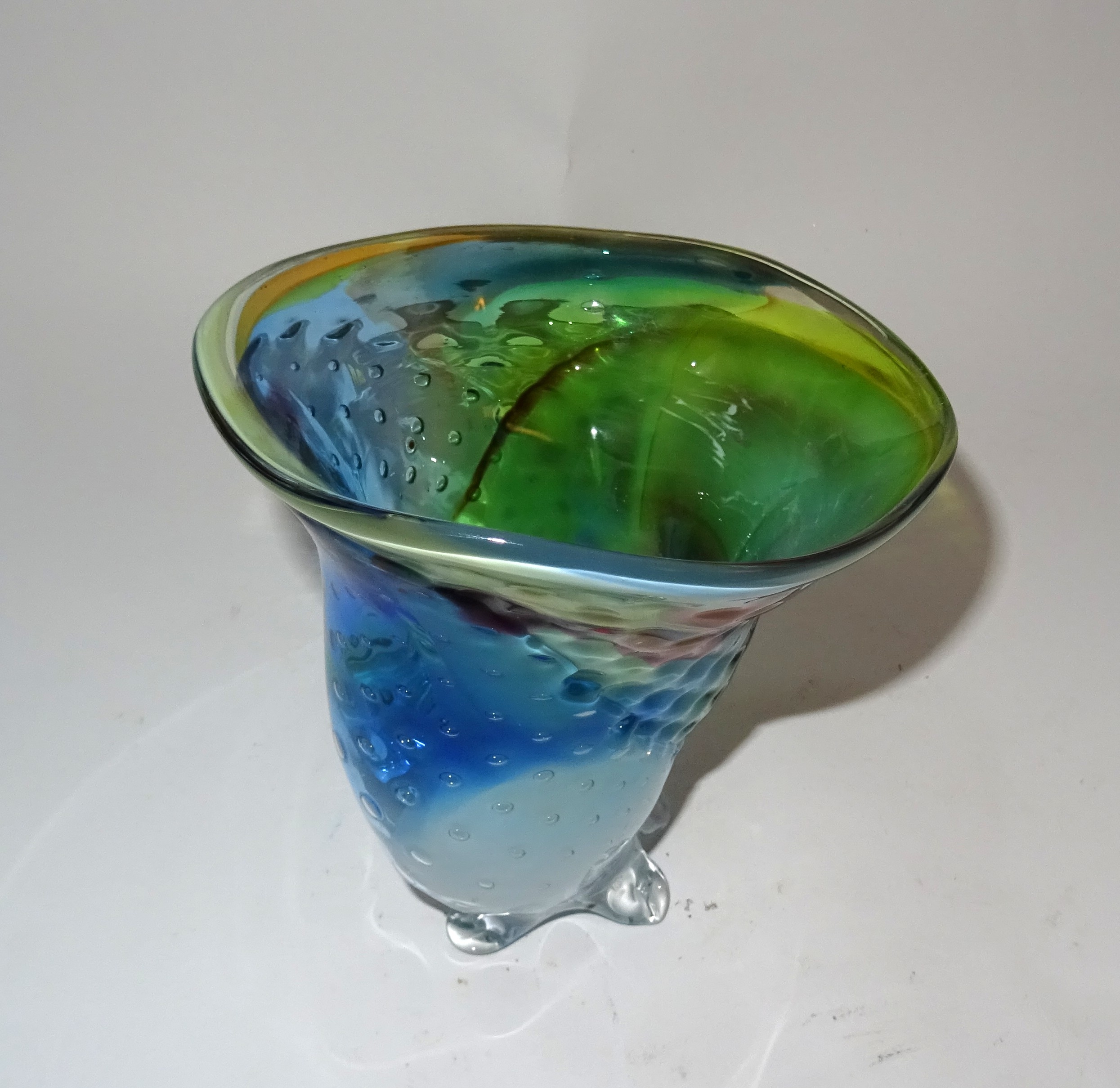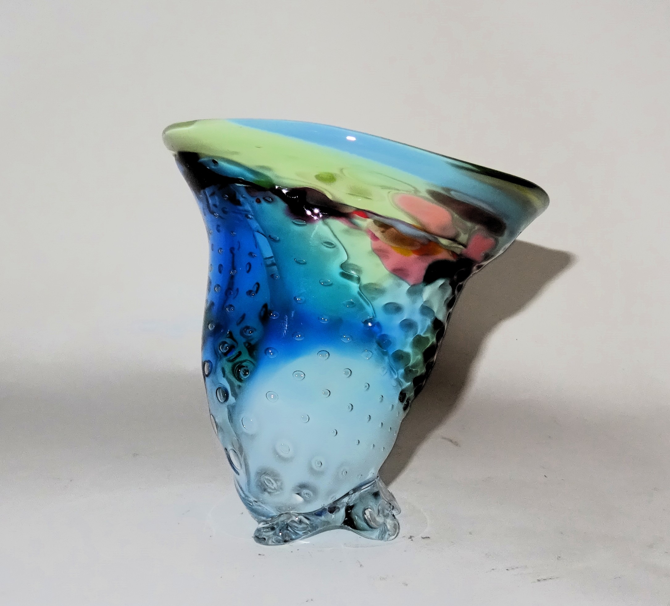 Een unica vaasje / glasobject met meerdere kleuren. Ontwerp en uitvoering Yvon Trossél.