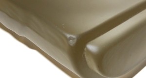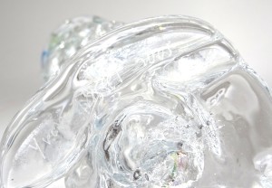 Een glasobject, blank gezandstraald oppervlak met gekleurde kern in twee helften. Ontwerp en uitvoering Gert Bullée.