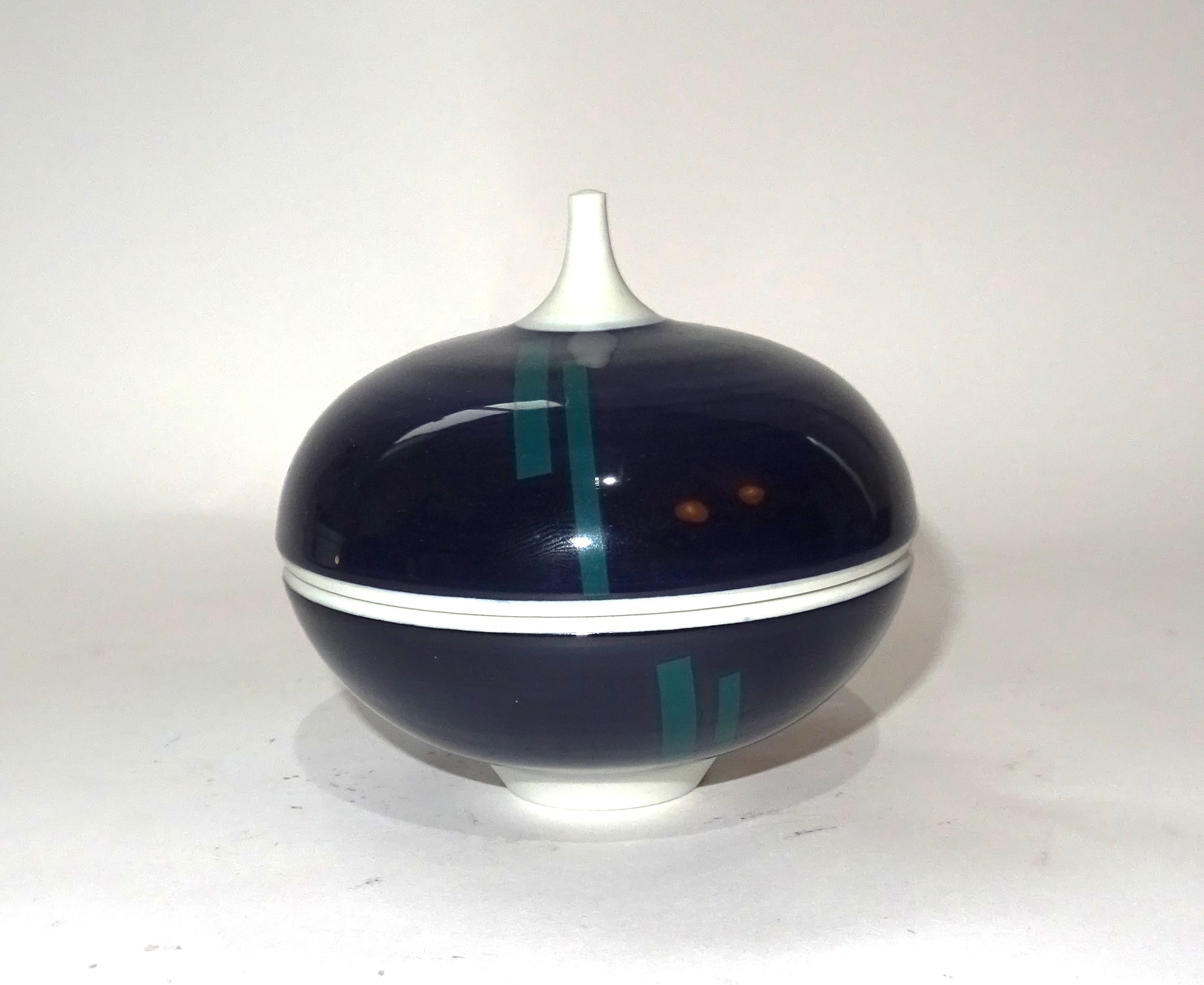 Een zwart geglazuurde porseleinen dekseldoosje met groene lijnen. Ontwerp en uitvoering Horst Göbbels in eigen atelier.