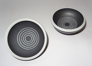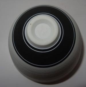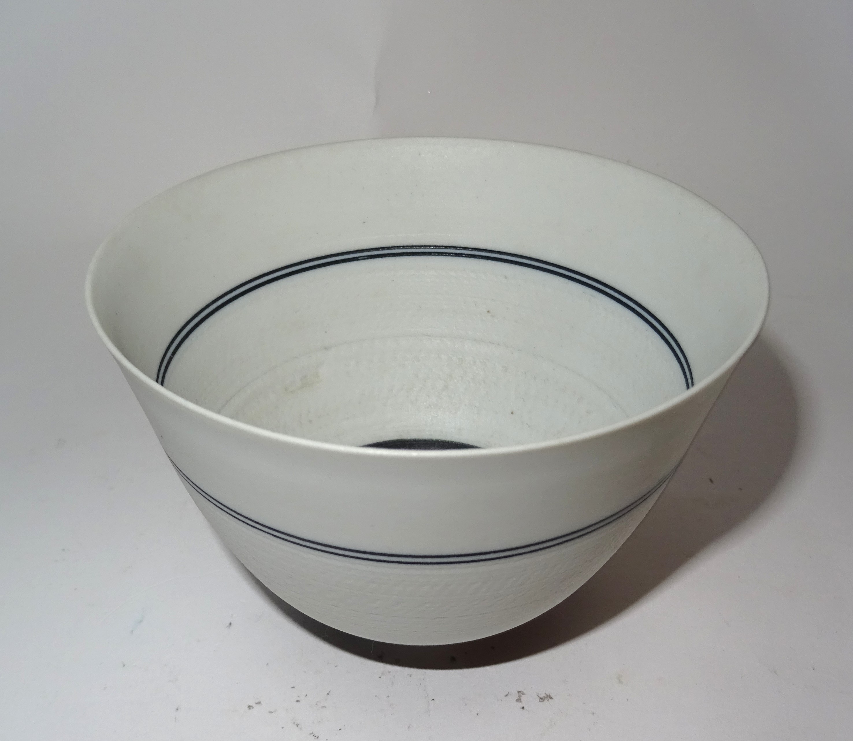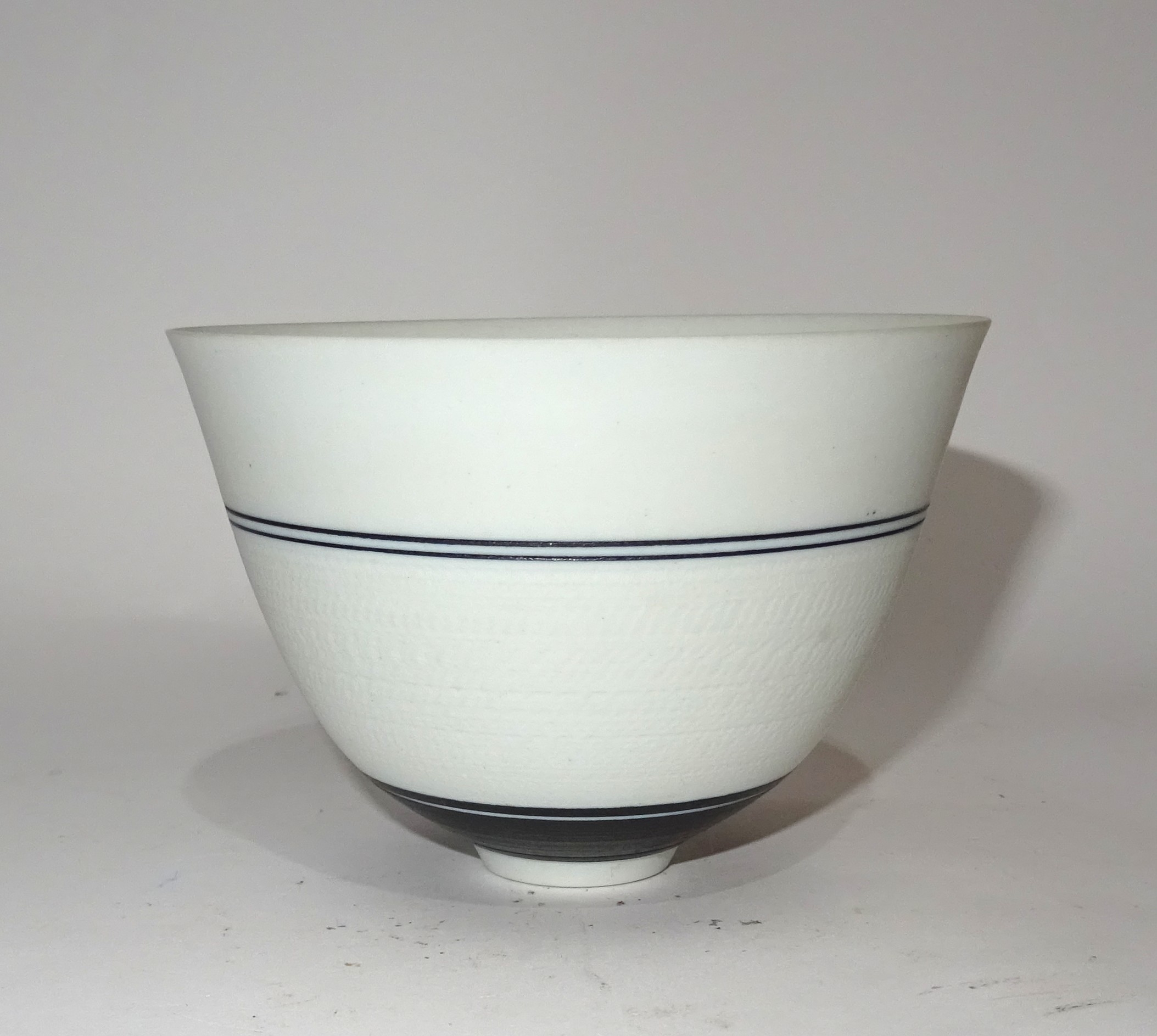 Een blank porseleinen kom met zwarte lijnen en bewerkt oppervlak. Ontwerp en uitvoering Horst Göbbels in eigen atelier.