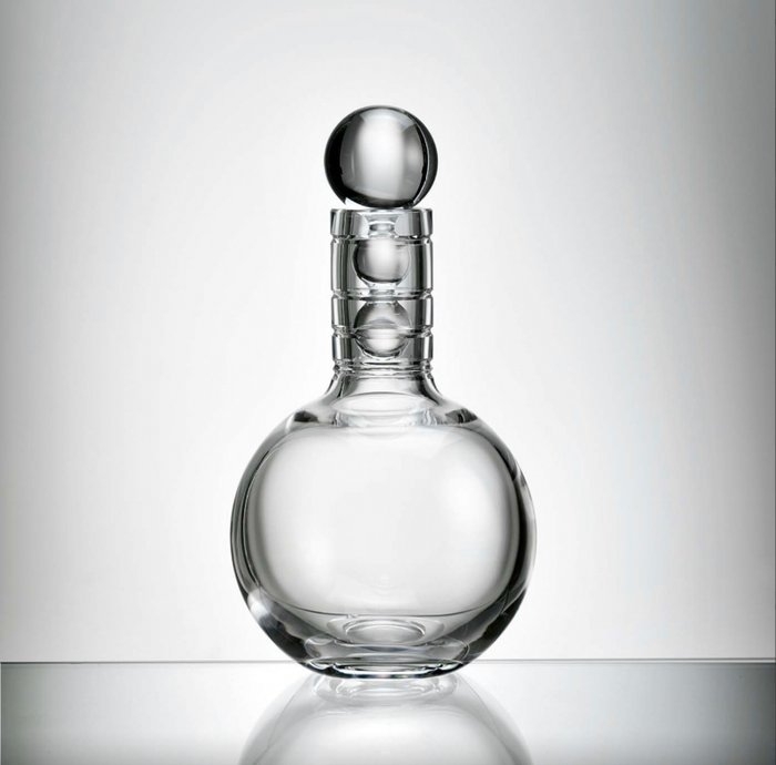 Zwaar geslepen karaf met ringen en stop met 3 bollen uit de A.D. Copier collectie 1961. Hoogte 27 cm.