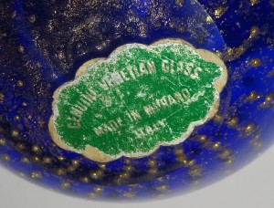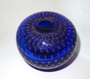 Kobalt blauw bolvaasje met luchtbellen en goudpoeder. Hoogte 8 cm, doorsnede 9 cm.