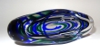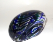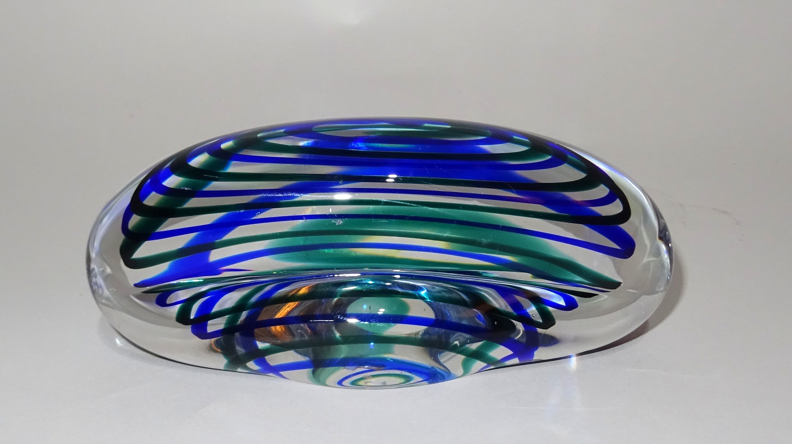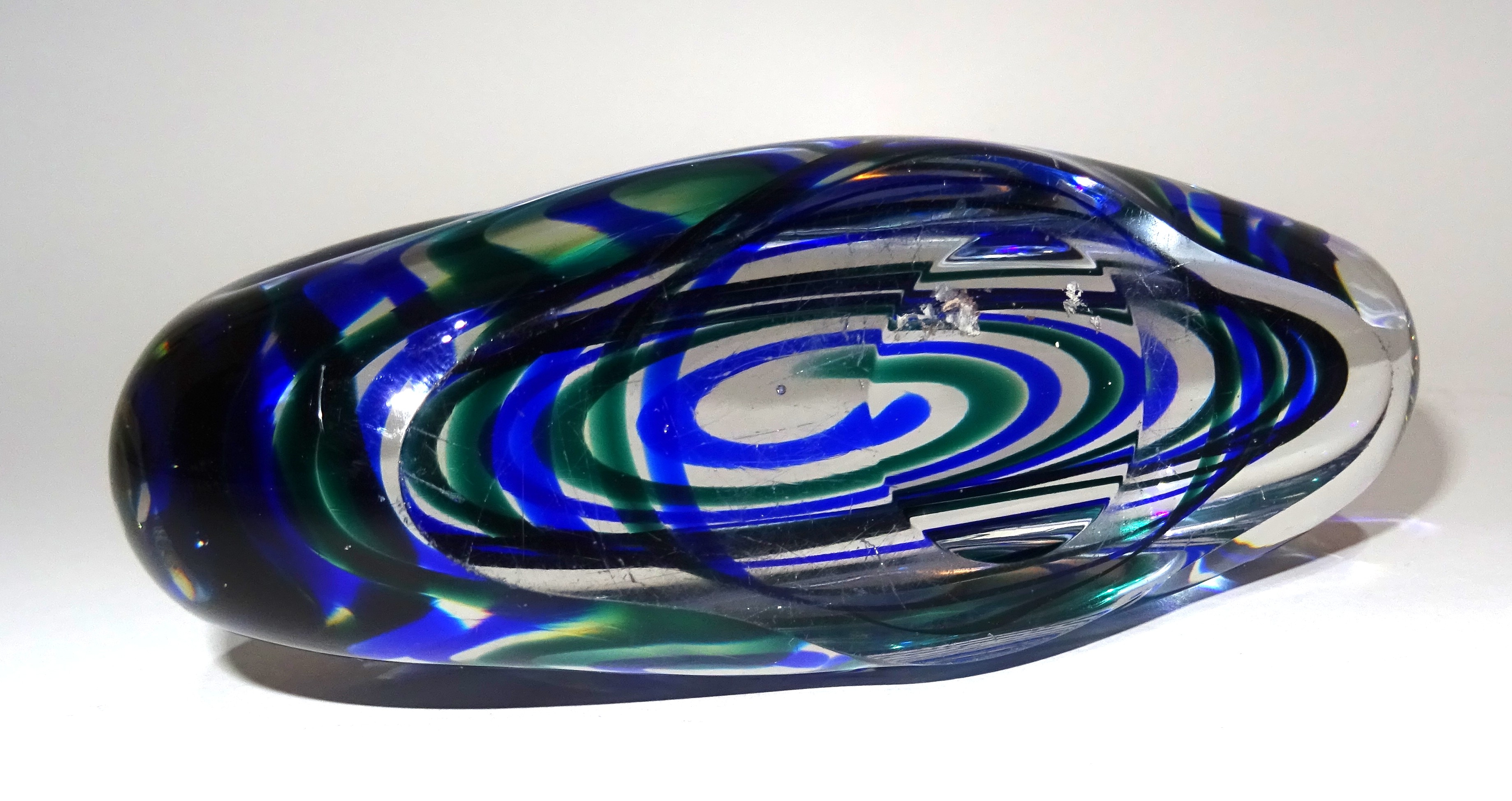 Een serica presse papier no. 11 met blauwe en groene kleurslingers. Ontwerp Floris Meydam voor Glasfabriek Leerdam 1953. Hoogte 6 cm, breedte 13,5 cm.