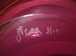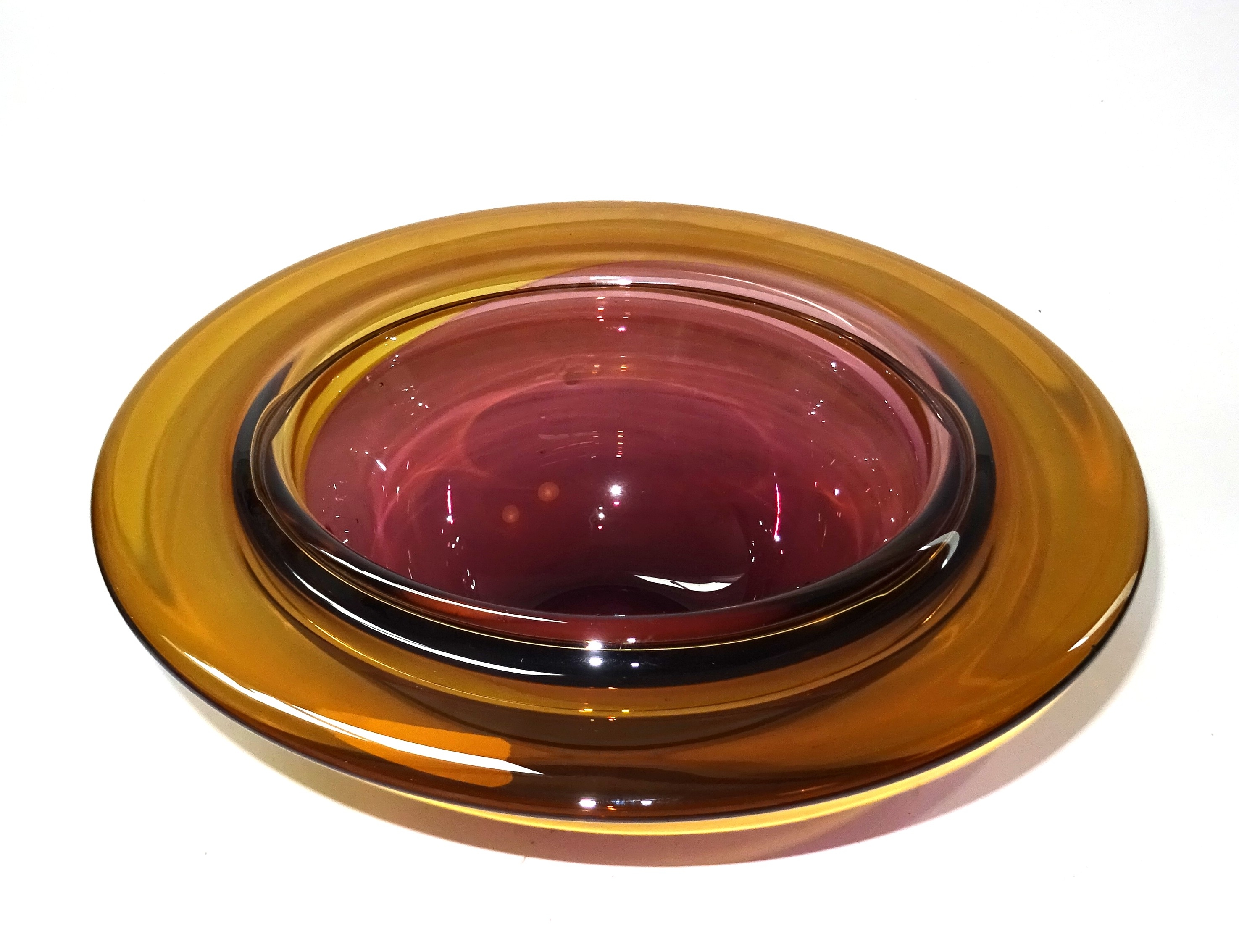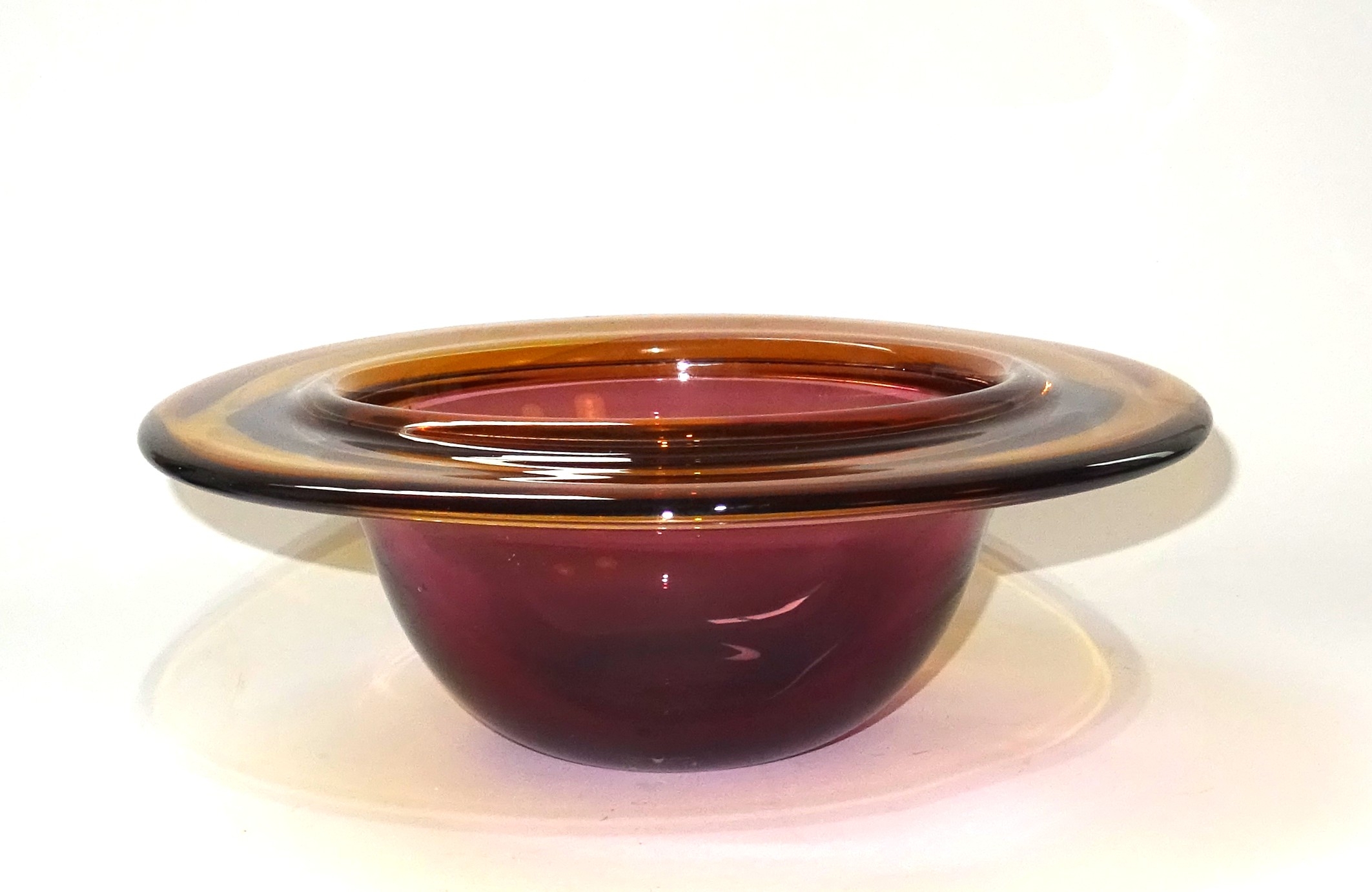 Mooi gekleurde kom / schaal, ontwerp en uitvoering Geir Nustad bij Glasblazerij Leerdam. Hoogte 10 cm, doorsnede 30 cm. Gesigneerd.