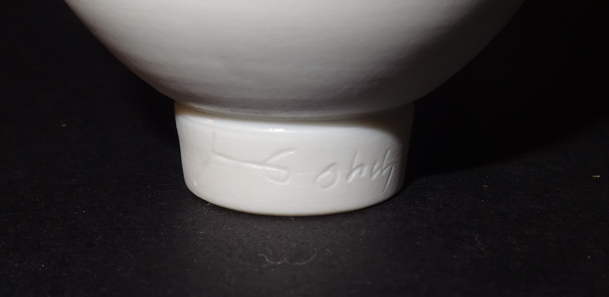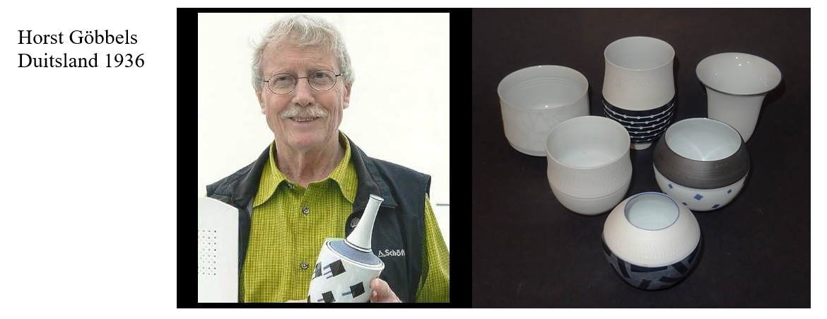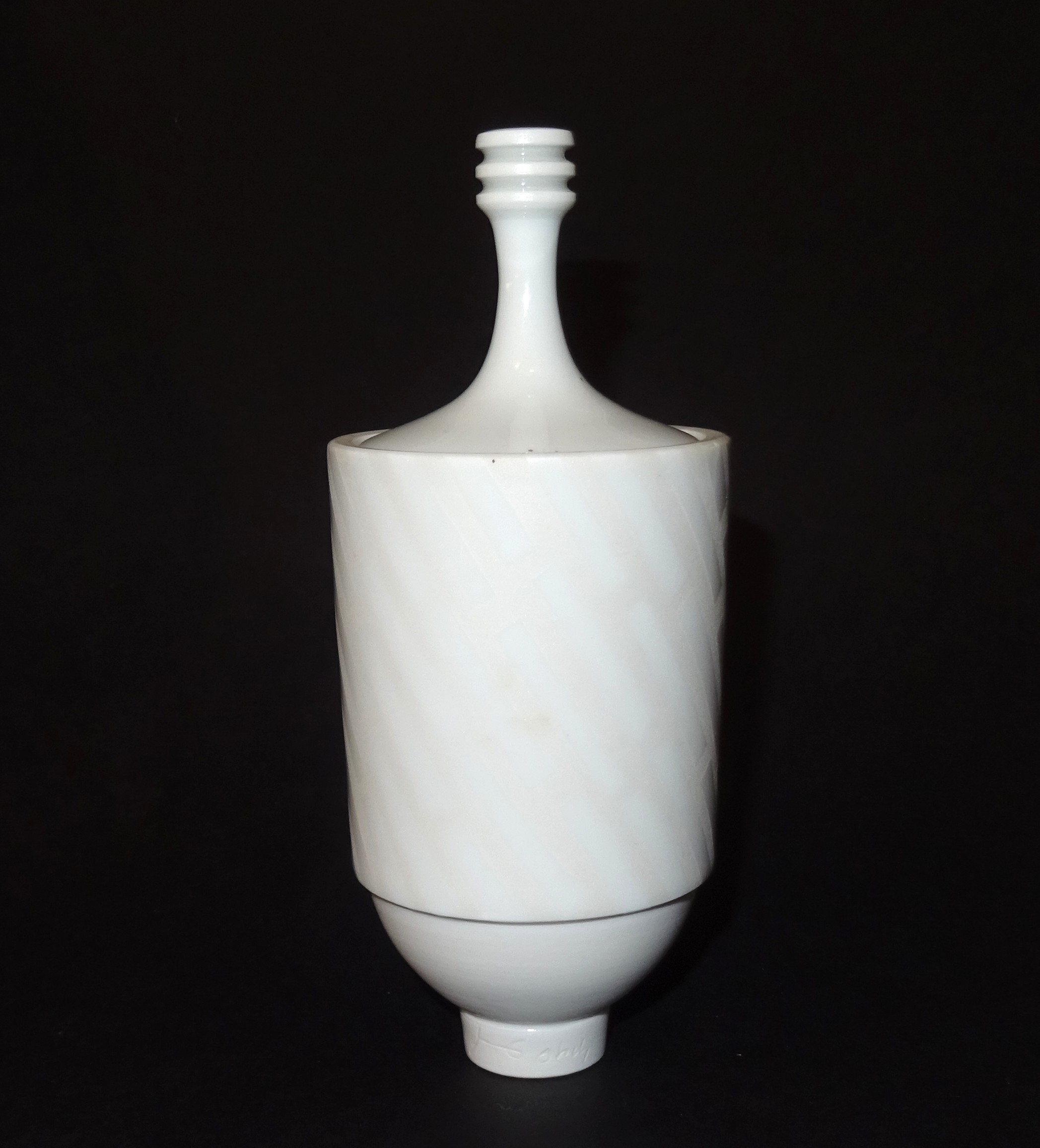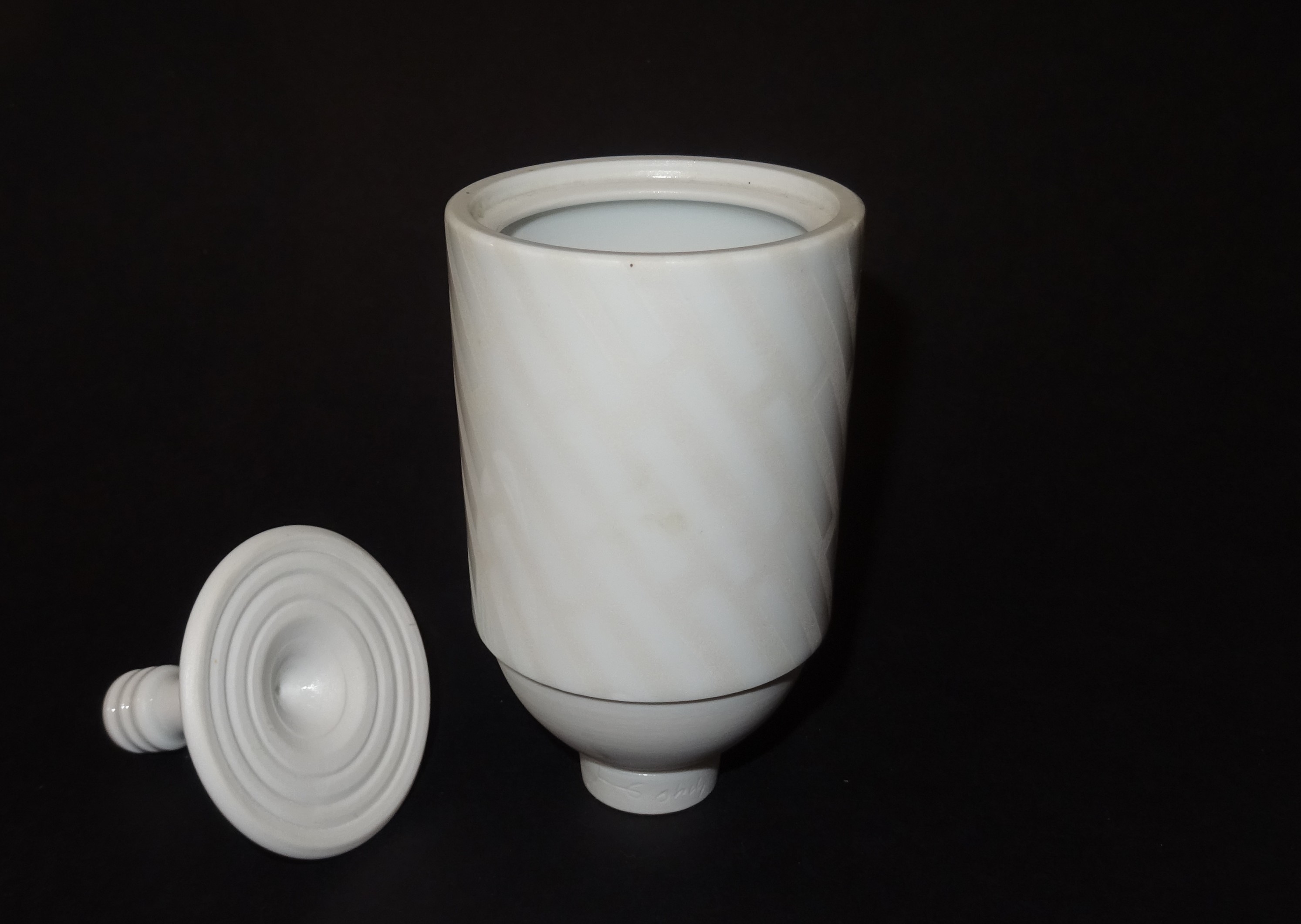 Porseleinen dekselvaasje, ontwerp en uitvoering Horst Göbbels in eigen atelier. Hoogte 15 cm, doorsnede 6,5 cm.