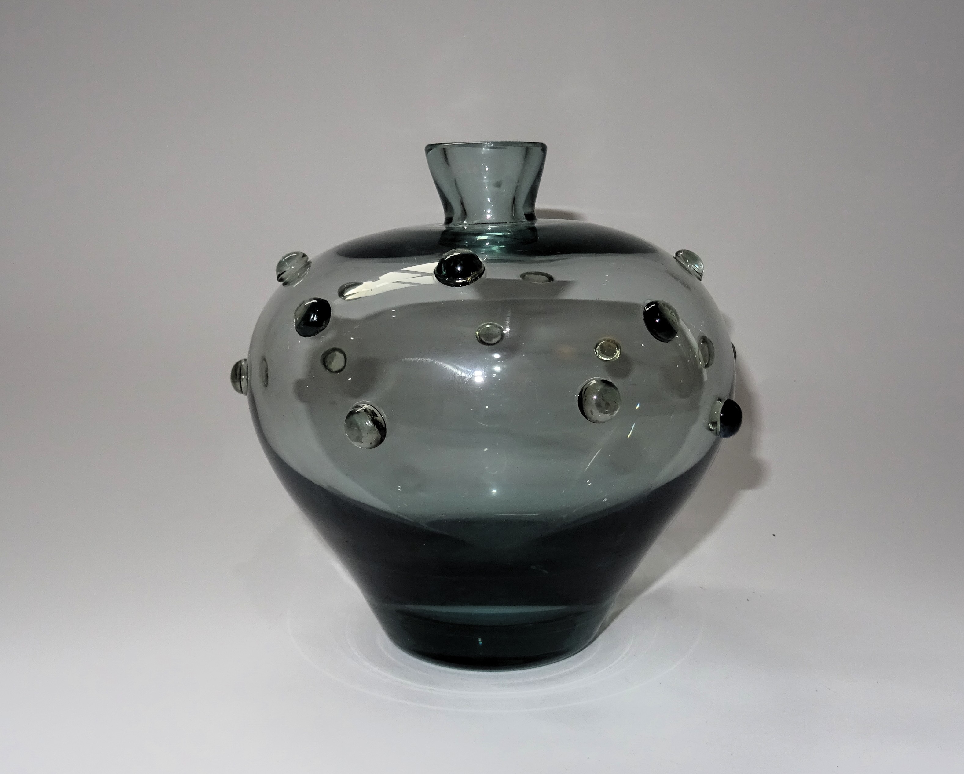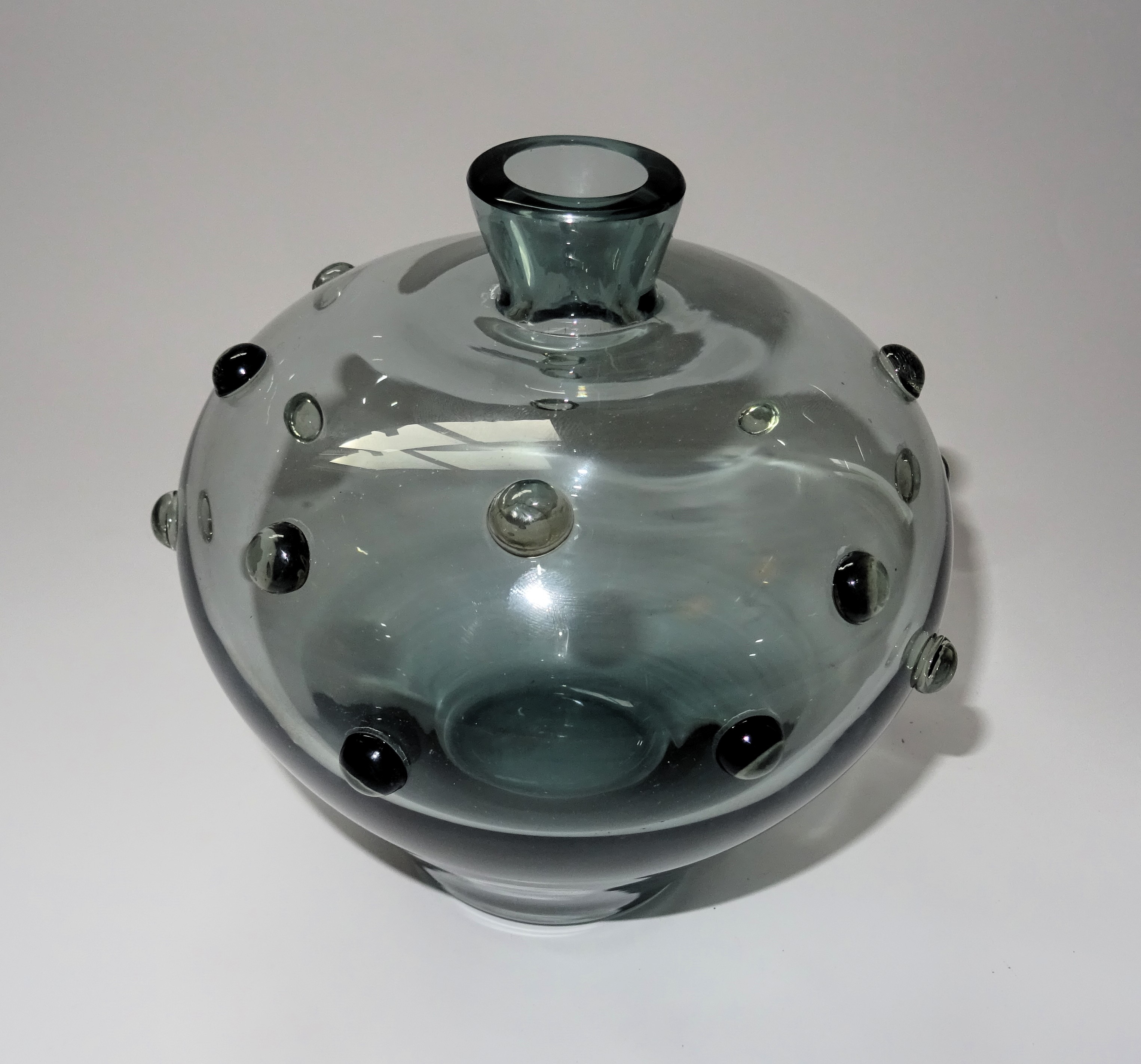 Staalblauw vaasje met aangezette noppen, ontwerp Ida Falckenberg-Liefrinck voor Glasfabriek Leerdam jaren dertig. Hoogte 15,5 cm, doorsnede 13 cm.