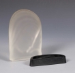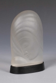Persglazen Madonna op persglazen ondervoet, ontwerp en uitvoering Jules Vermeire voor Glasfabriek Leerdam ca. 1932. Hoogte 24,5 cm. Het persglazen voetstuk is waarschijnlijk van latere datum. Conditie goed, een persfoutje op de hoek (zie foto) waarschijnlijk door vuiligheid in de mal.