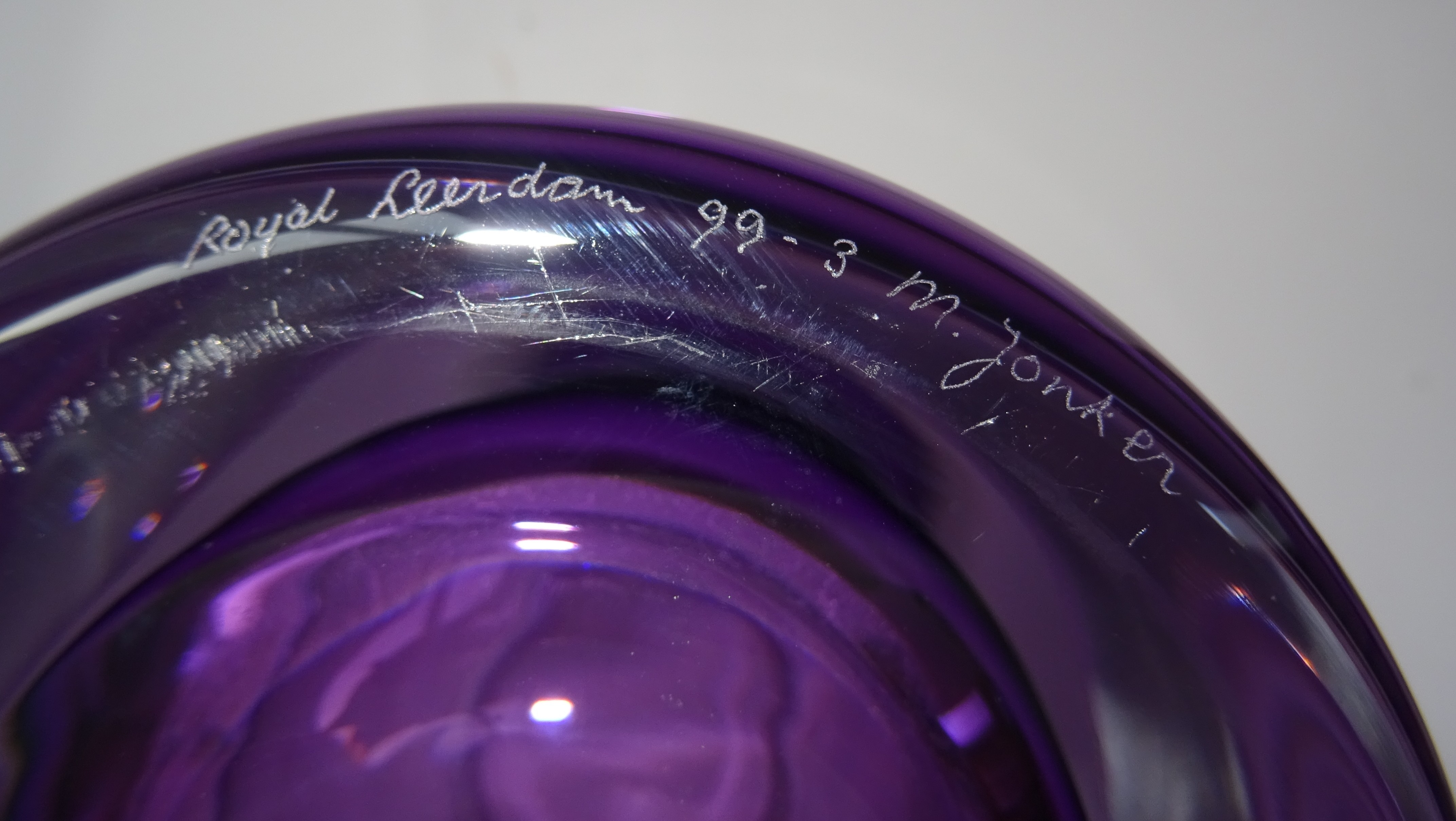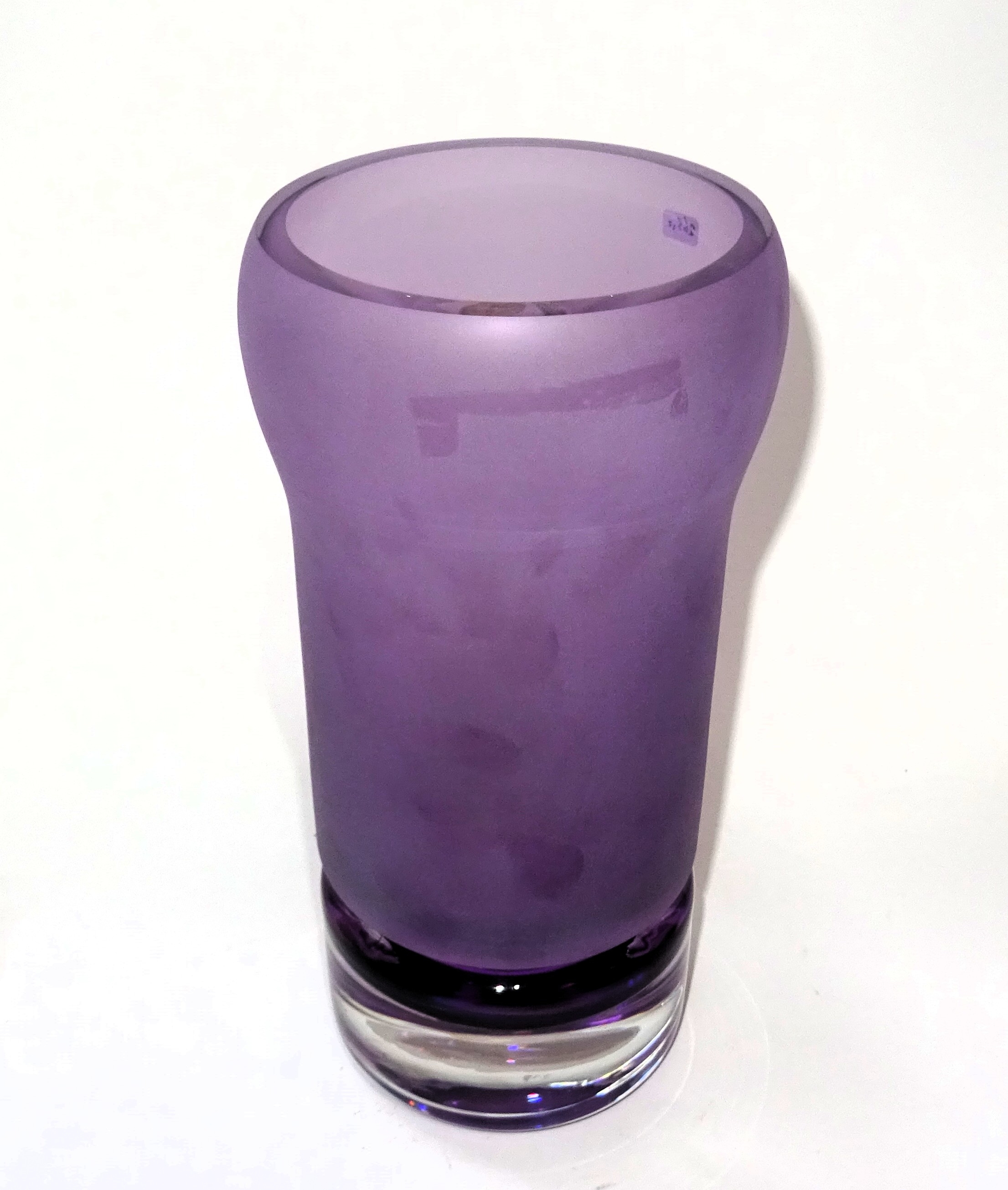 Een paars glezen vaas uit de serie Erica en Still. Paars glas met blank aangezette voet en deels gezandstraald. Hoogte 27 cm, doorsnede 13 cm. Gesigneerd en genummerd en met certificaat.