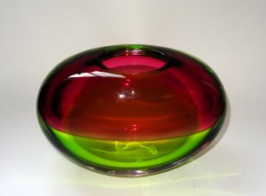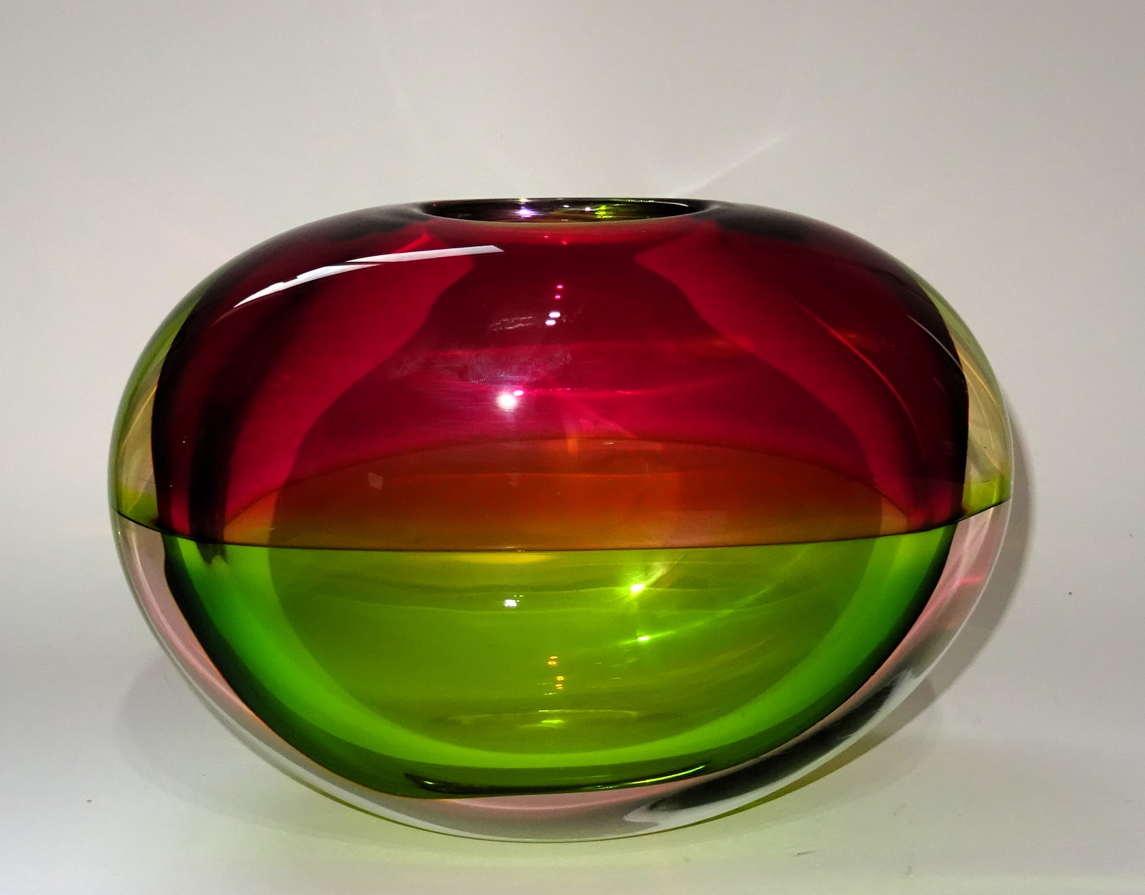 Ovale bolvaas, ontwerp en uitvoering Ondrej Novotny bij Glasblazerij Leerdam. Hoogte 19 cm, breedte 25 cm.