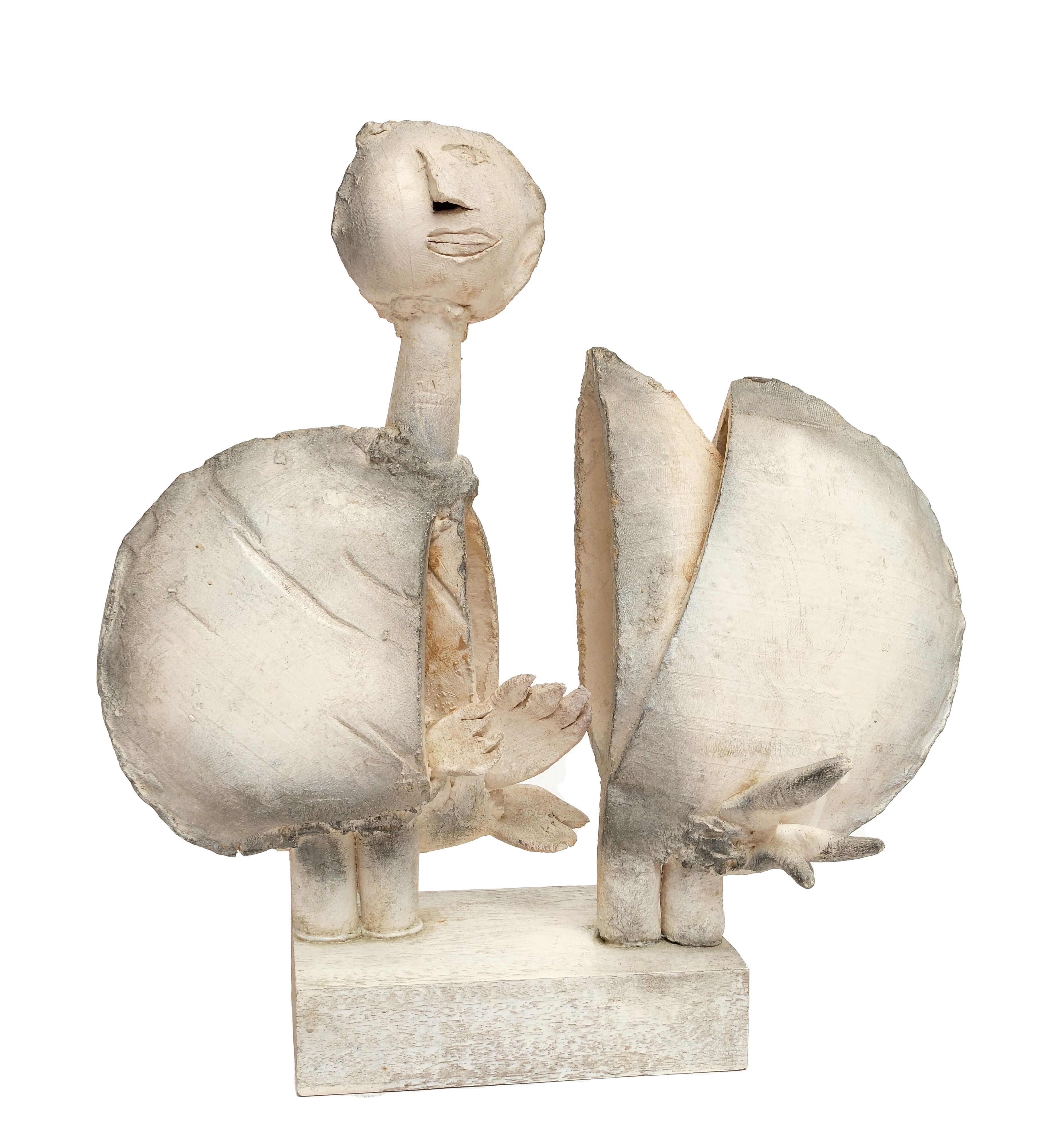 Een Cobra stijl beeld, ontwerp en uitvoering Rob Stultiens in eigen atelier. Keramiek beeld op houten voet, afmeting ca. 35x37 cm.