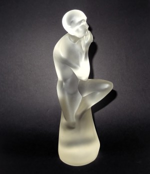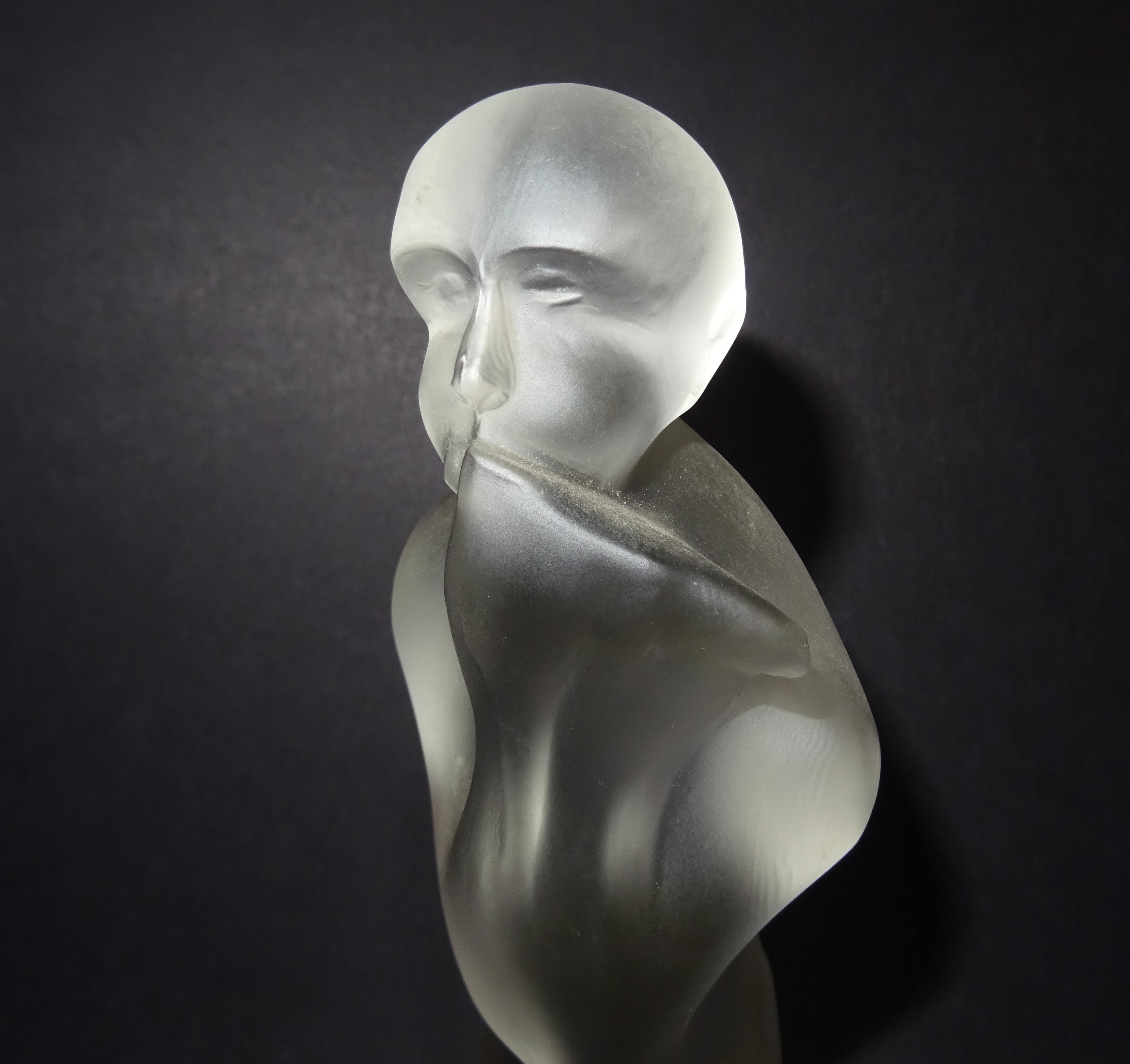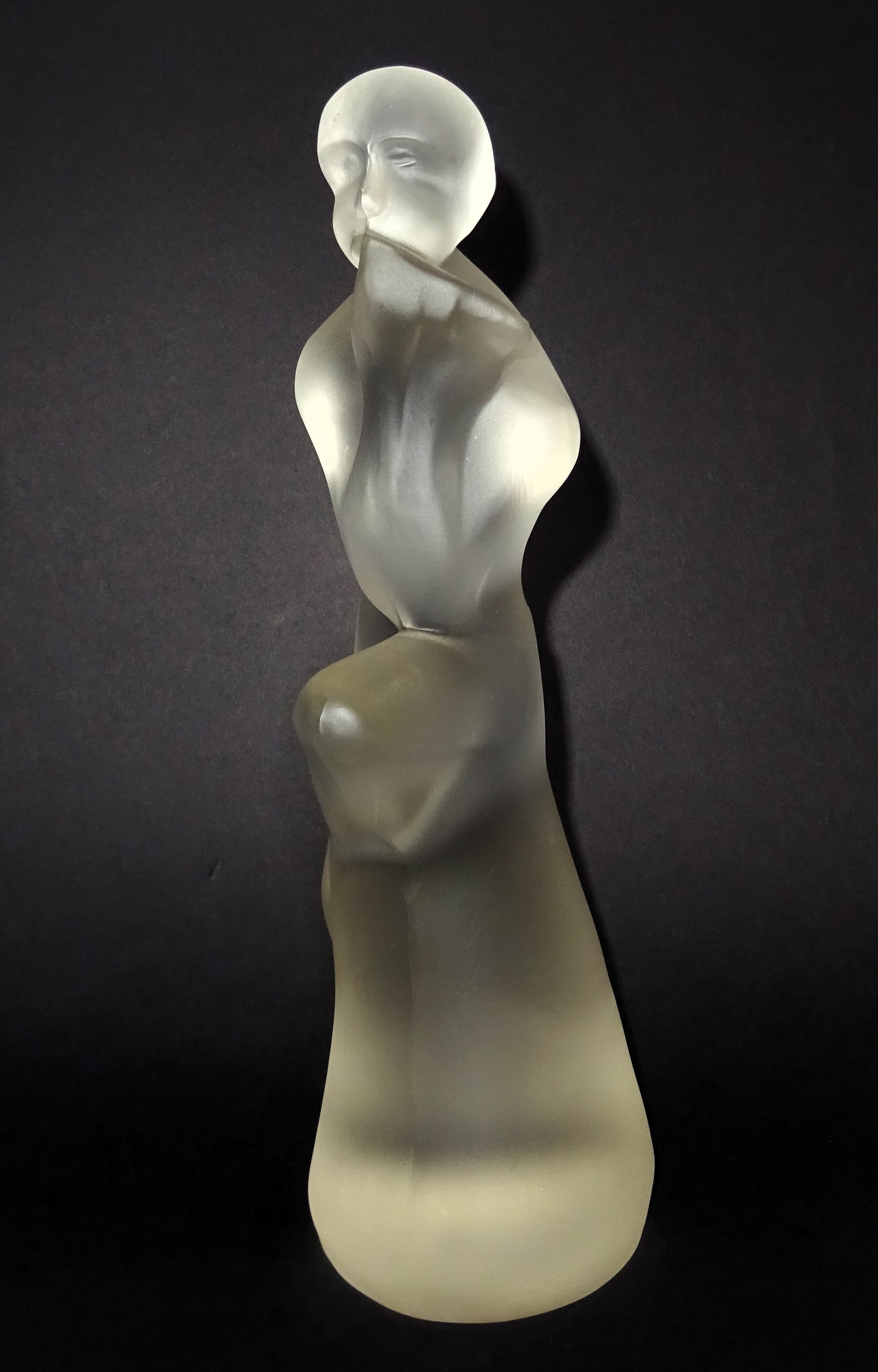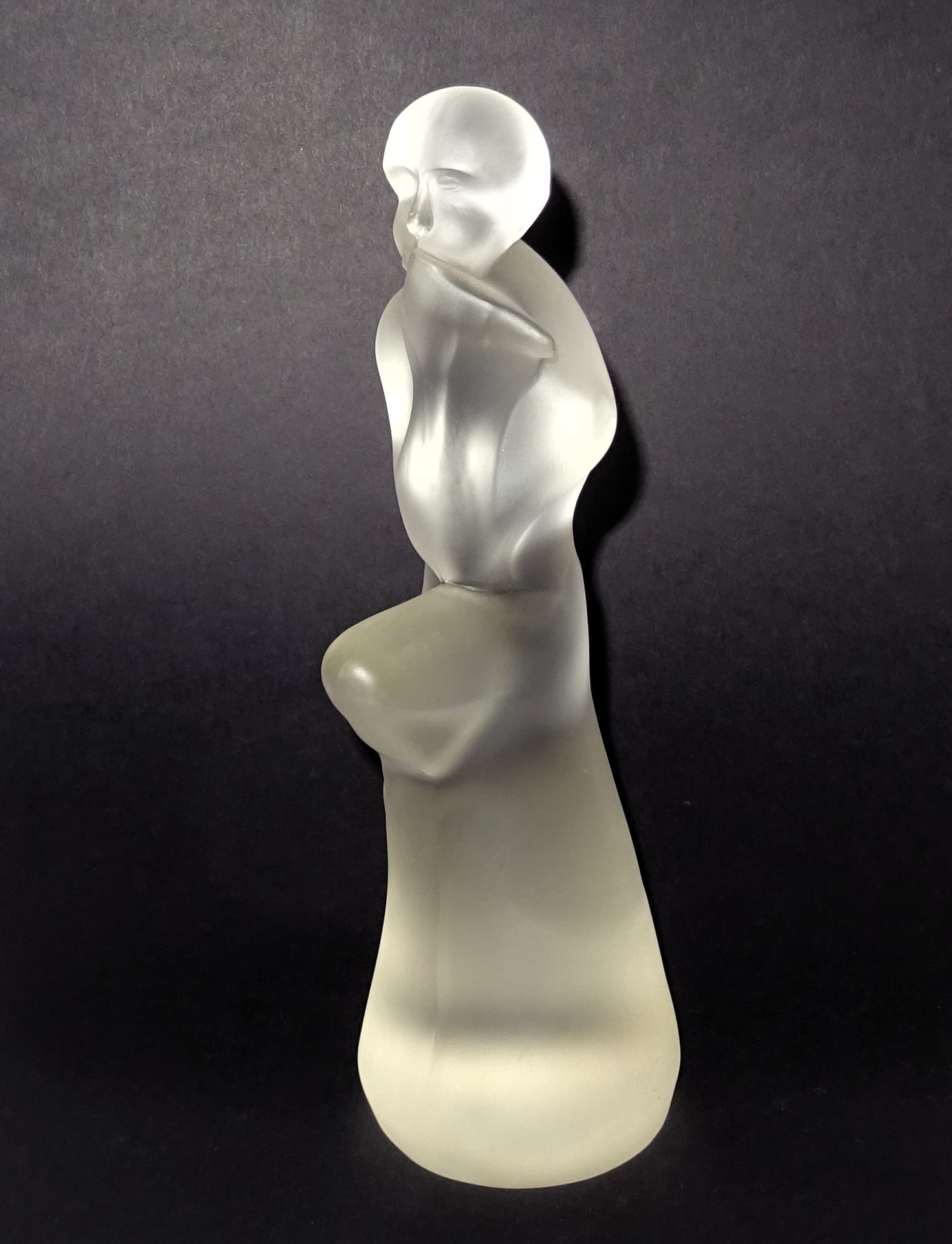 Een gesatineerd beeld van een fluitspeler, ontwerp Stef Uiterwaal voor Glasfabriek Leerdam ca. 1932. Hoogte 31 cm.